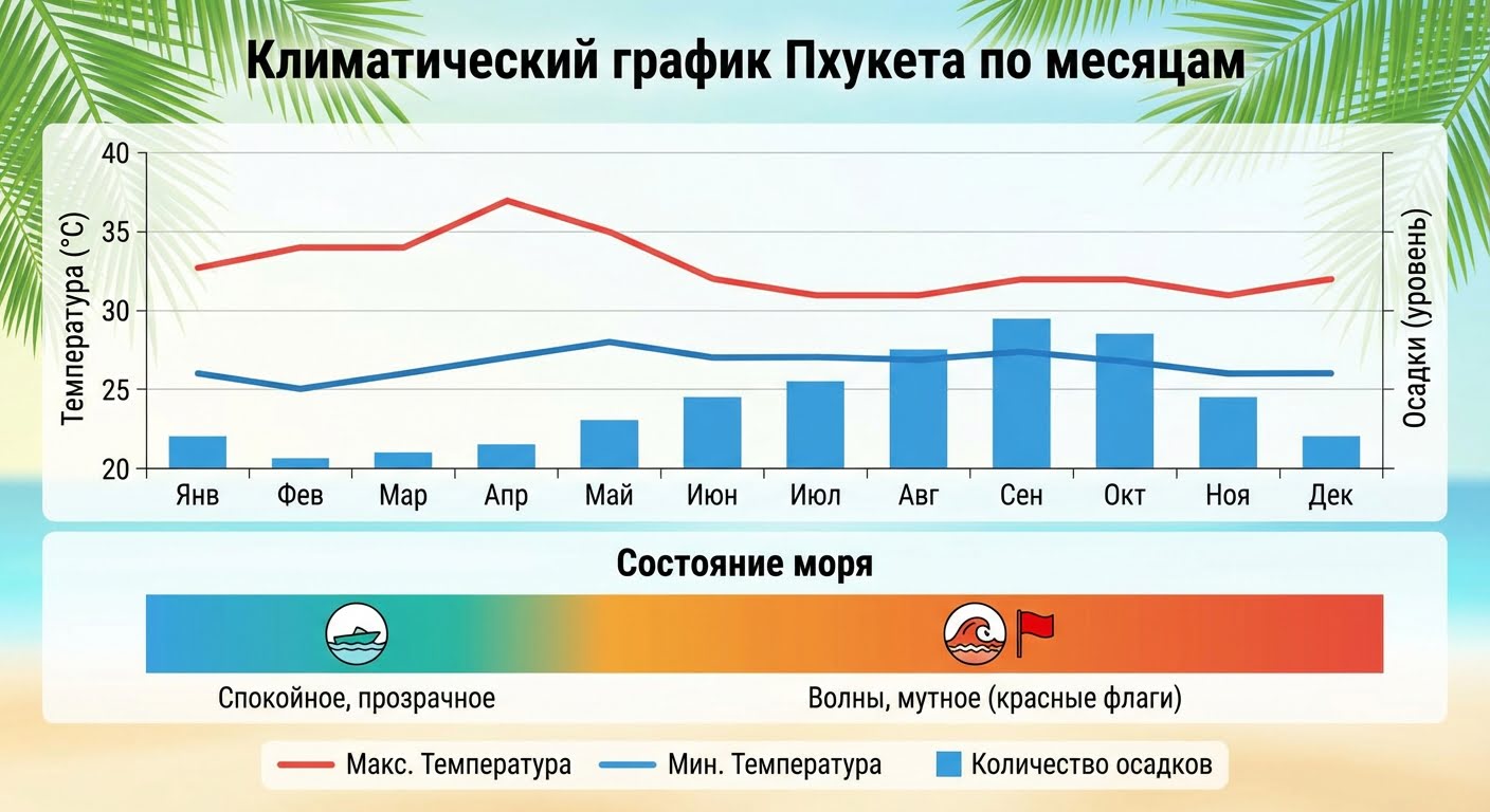Идеальные месяцы — с середины декабря до конца февраля. Это пик сезона. Погода стабильная и предсказуемая: утром просыпаешься — солнце, днем загораешь — солнце, вечером ужинаешь на веранде — ни облачка. Море абсолютно спокойное, вода прозрачная, волн почти нет. Правда, в это время на Пхукете больше всего народу. На популярных пляжах типа Патонга или Карона в разгар дня бывает тесновато. И цены на отели достигают максимума — в декабре-январе номер может стоить в два раза дороже, чем в июне.