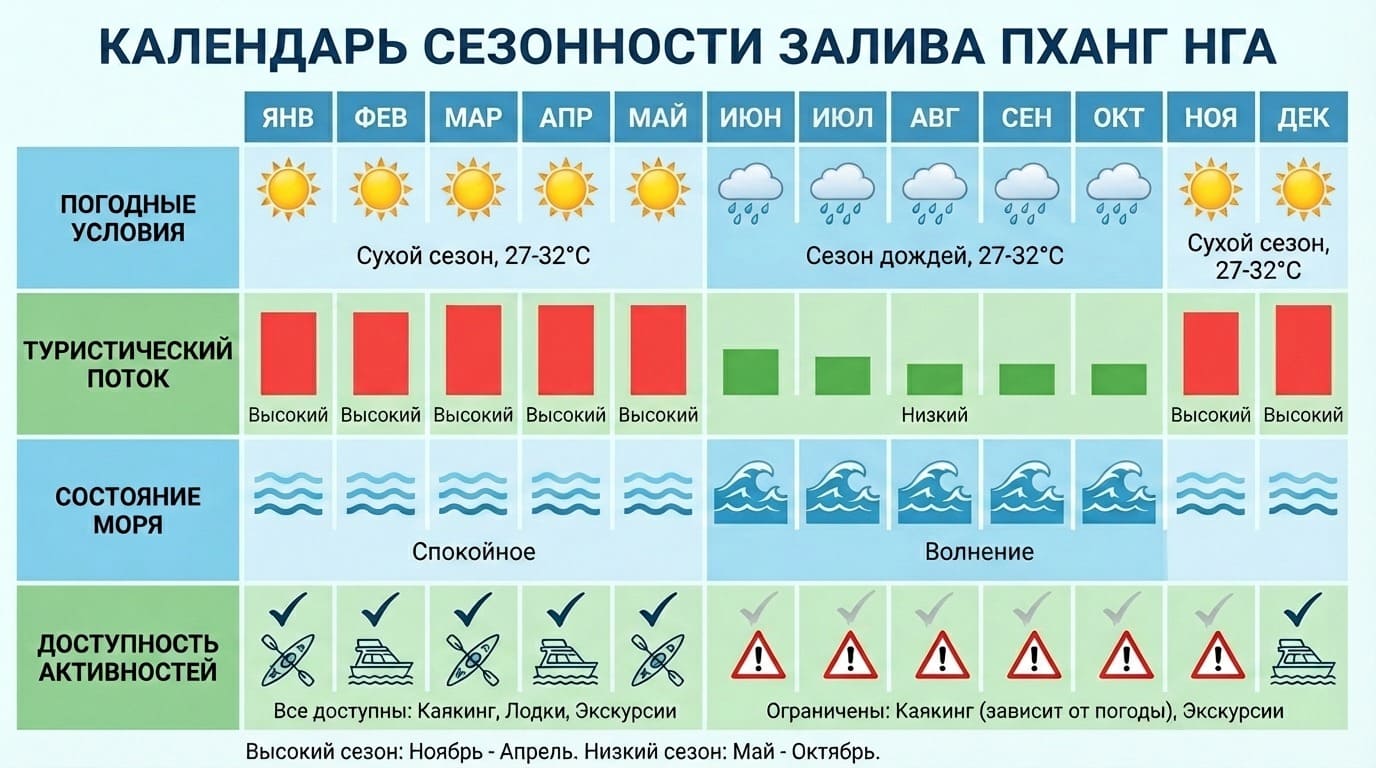 В сухие месяцы море спокойнее, поэтому проще попасть на остров и дольше гулять на воде. В пиковые недели туристов больше, а цены на экскурсии и трансфер могут быть выше, поэтому ранний старт утром часто выигрывает по комфорту.