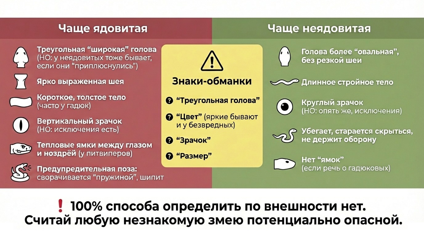 - Форма головы. У многих ядовитых змей голова треугольная или «копьевидная» — это характерно для гадюк и щитомордников. Но у кобр и крайтов голова относительно округлая, как у неядовитых видов. Так что треугольная голова — подсказка, но не правило.