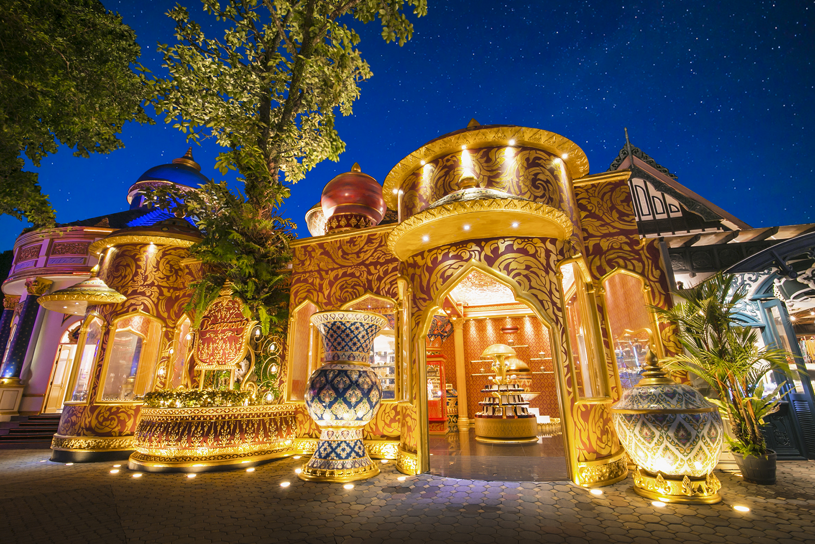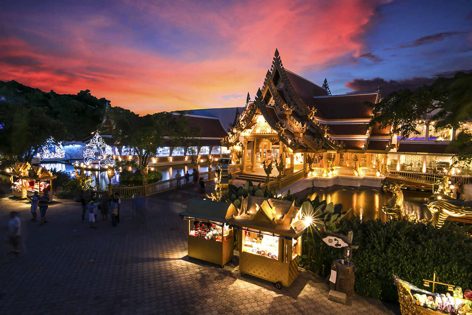Вход в парк Фантазия на Пхукете начинается с Фестивальной деревни, насыщенной архитектурой в тайском стиле. В лавках мастеров можно приобрести магниты, кожаные и шелковые изделия, а также драгоценные украшения.